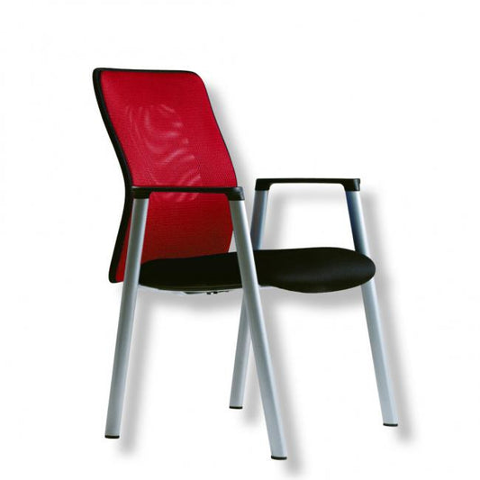 Rokovacia čalúnená stolička s pevnou robustnou konštrukciou. Sivá kostra, operadlo čalúnené samonosnou sieťovinou, nosnosť 120...