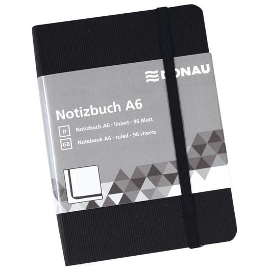 Zápisník s elastickou gumičkou, lacetkou a pútkom na pero v červenej farbe. Pevná čierna väzba...
