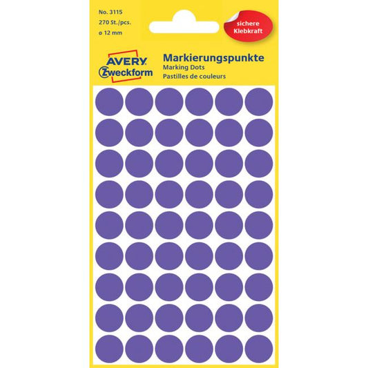 Kruhové etikety na ručný popis. Priemer 12 mm, v balení 270 etikiet. Farba fialová.