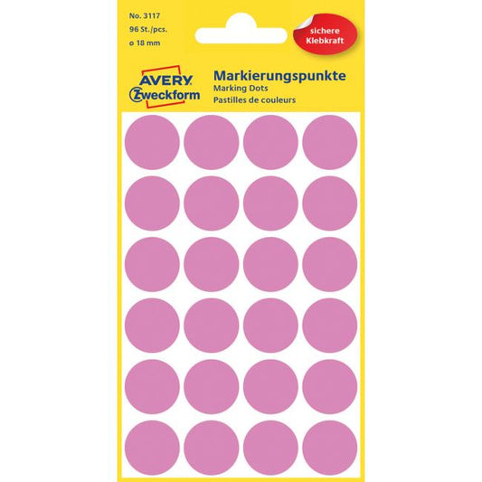 Kruhové etikety na ručný popis. Priemer 18 mm, v balení 96 etikiet. Farba ružová.