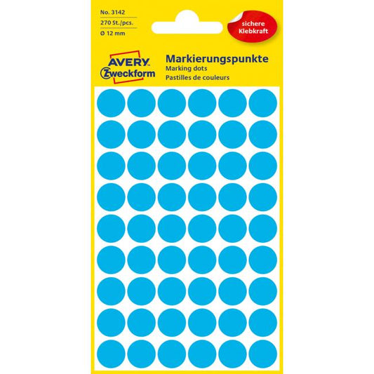 Kruhové etikety na ručný popis. Priemer 12 mm, v balení 270 etikiet. Farba modrá.