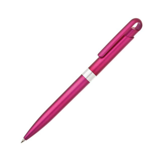 Plastové guľôčkové pero OIRA s kovovými doplnkami. Modrá náplň veľkoobjemová. Farba bordová.