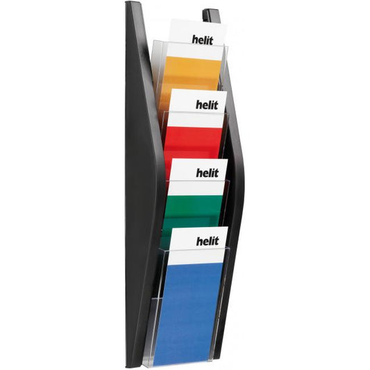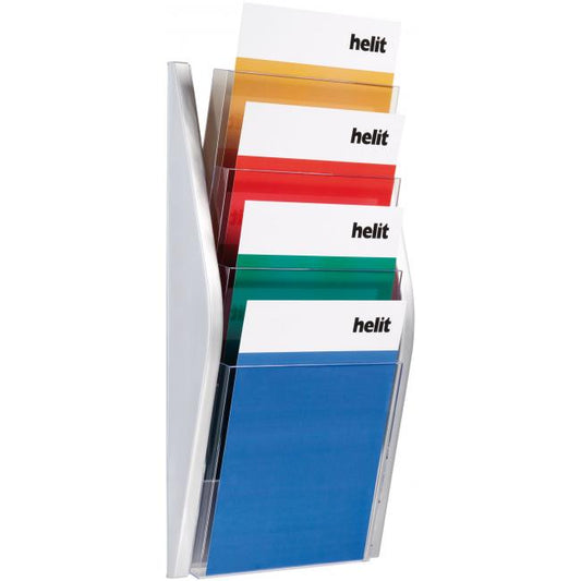 Nástenný stojan na prezentáciu materiálov. Štyri priehľadné priehradky slúžia na umiestnenie materiálov formátu A4. Materiál kvalitný plast....