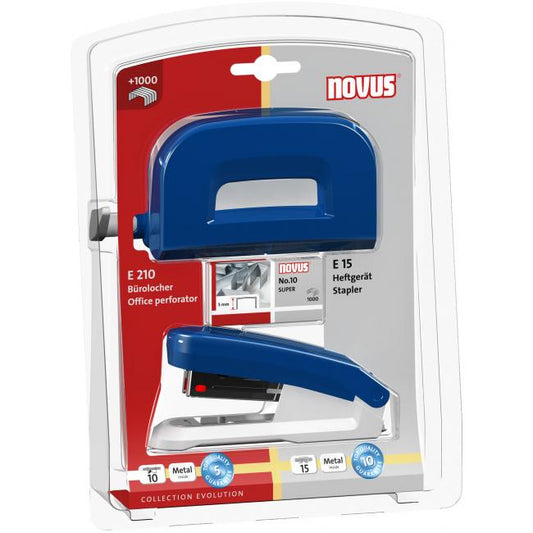 Súprava kancelárskych produktov obsahuje zošívačku Novus E 15, dierovačku Novus E 210 a spinky No.10...