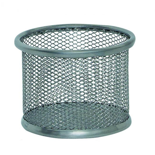Stojan na kancelárske spony v drôtenej úprave. Priemer 90 mm, výška 68 mm. Farba strieborná.