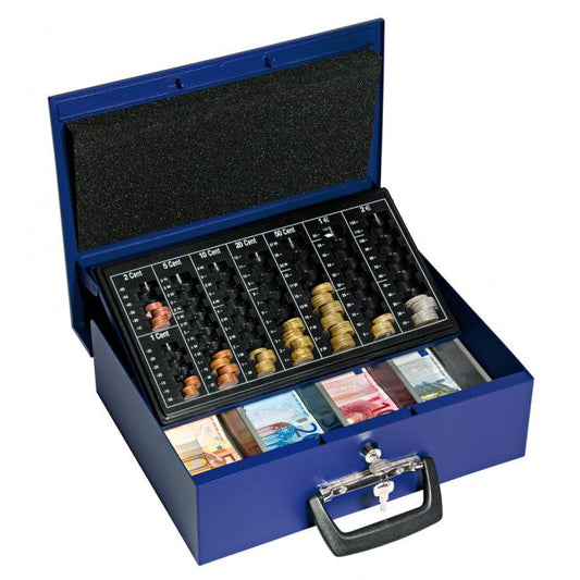 Pokladnička vybavená mincovou priehradkou s ôsmimi oddielmi na eurá a centy a štyrmi prístupnými priehradkami na bankovky. Pena na vnútornej strane...