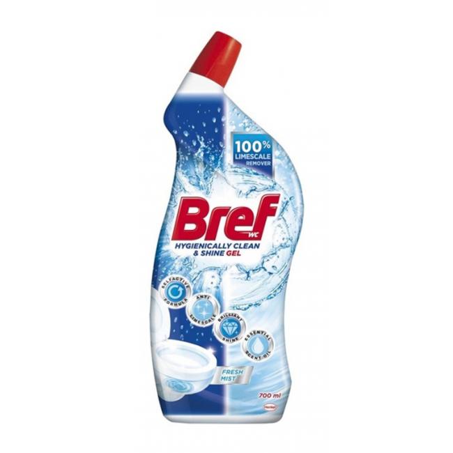 Bref WC gél účinne odstraňuje škvrny, vodný kameň a pomáha udržiavať hygienickú čistotu a sviežosť. Praktický dávkovač dosiahne aj pod okraj misy a odstráni škvrny a vodný kameň. Objem 700 ml. Vôňa fresh.