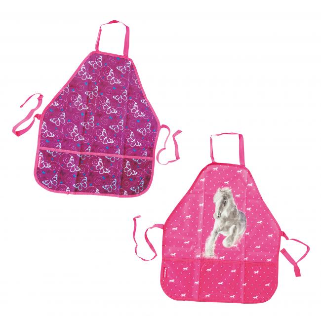 Detské zástery s menovkou. Veľké predné vrecko s 3 menšími vreckami, zapínanie na suchý zips u krku a šnúrkami na bruchu. Rozmery 54 x 46 cm, materiál polyester, mix motívov pre dievčatá: Delfín, Kôn.