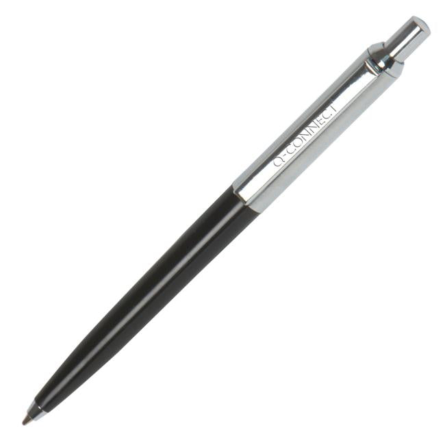 Guľôčkové pero v klasickom dizajne, plast/ kov s pevným kovovým klipom, nápis v modrej farbe. Šírka stopy: M. Farba čierna.