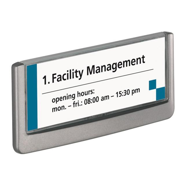 Moderná informačná tabuľka na dvere s lemom v atraktívnej grafitovej farbe. Predný panel sa otvára na jedno zatlačenie, a tým sa jednoducho sprístupnia vložené popisné papiere, ktoré sa môžu vymieňať podľa potrieb. Tabuľka je ideálna do kancelárií, úradov, škôl, univerzít a hotelov. Súčasťou balenia je montážna sada s názorným návodom. Namiesto pevného montovania môže byť tabuľka k povrchu aj prilepená.