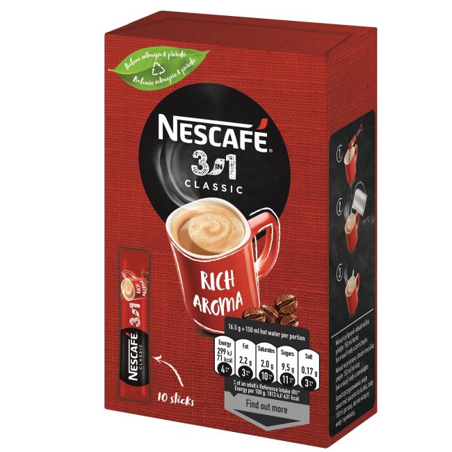 S kávami NESCAFÉ si môžete vychutnať autentickú chuť a arómu kávy NESCAFÉ s jemne mliečnou a sladkou chuťou, obohatenou o lahodnú penu na povrchu. Vďaka praktickému baleniu v jednoporciových vreckách si pohodlne pripravíte svoju obľúbenú šálku NESCAFÉ Classic kedykoľvek a kdekoľvek. Hmotnosť 10 × 16,5 g.