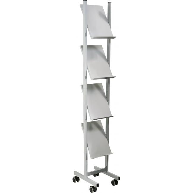 Vysoko kvalitný elegantný a pevný mobilný prezentačný stojan na časopisy alebo katalógy formátu A4. Stojan je dodávaný v rozloženom tvare. Materiál kov. Farba svetlosivá. Štyri police na 4 × A4 formáty. Rozmery (š × v × h) 260 × 1 580 × 390 mm.