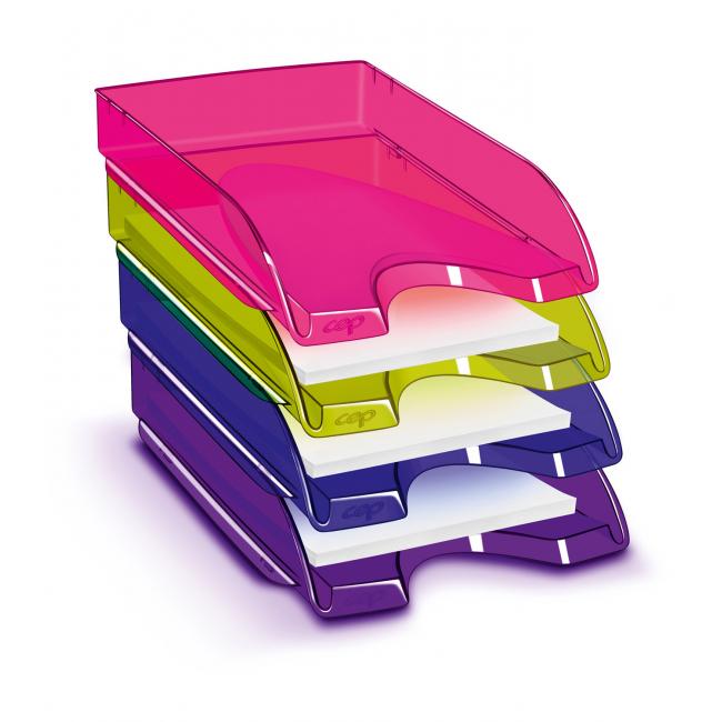 Vďaka štíhlym a elegantným líniám si tento odkladač nájde miesto nielen na stole, ale aj na bočnom stole alebo v skrini. Je vhodný na dokumenty do veľkosti 24 × 32 cm. Široký čelný výrez umožňuje ľahké vyberanie obsahu. Odkladač je stohovateľný vertikálne, aj stupňovito dozadu. Kapacita 450 listov (80 g / m²). Celkové rozmery 257 × 348 × 66 mm. Materiál 100% odolný vysokokvalitný plast. Jednotlivé kusy sa môžu navzájom jemne farebne líšiť. Väčšie balenie 10 ks. Farba transparentná fialová.