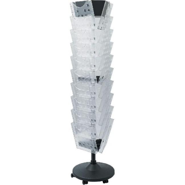 Mobilný otočný stojan dodávaný s 30-timi univerzálnymi odkladačmi formátu A4, uloženými v troch radoch po 10 odkladačov.Pevná základňa na kolieskach.Farba stojana čierna, odkladače priehľadné číre.