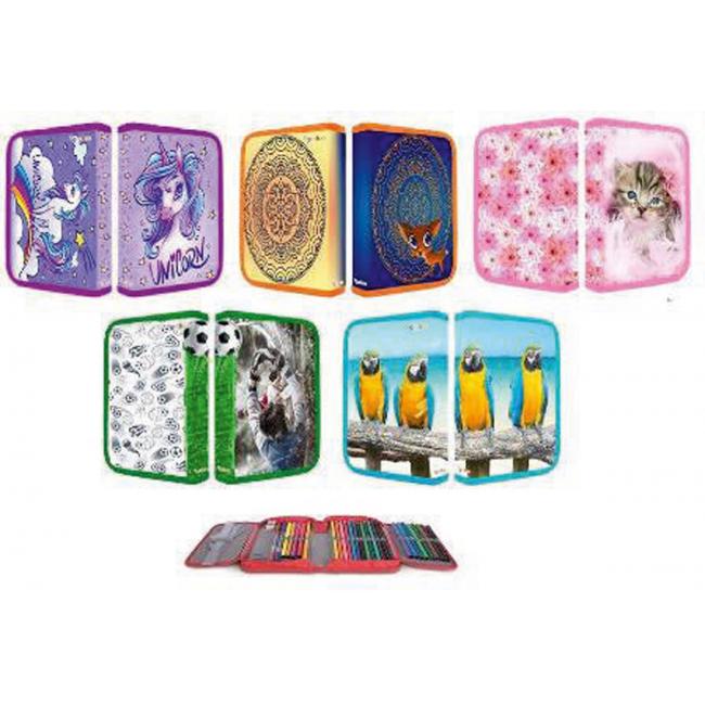 Kvalitné 2-klopé peračníky s príslušenstvom, 32 dielov. Dodávané v mixe tohtoročných vzorov. Rozmery 19,5 x 13,5 x 3,2 cm. Balenie 10 ks. Farba mix.