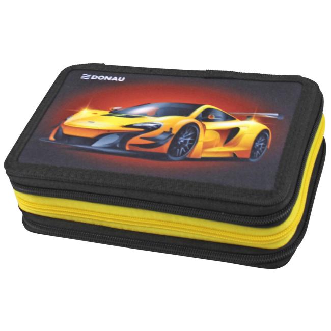 Plný peračník s 3 poschodiami, malým všitým vrecúškom, obsahuje 43 dielov: 1 guma, 1 strúhadlo, 3 ceruzky, 1 pravítko, 1 rozvrh hodín, 18 vláknitých pier, 18 farebných ceruziek. Materiál polyester, rozmery 200 × 60 × 130 mm.