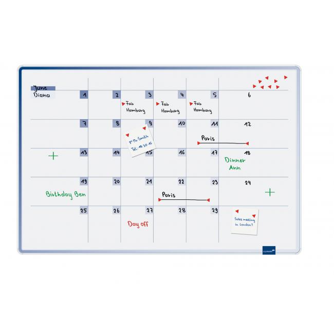 Mesačný plánovač v 6-mesačnom formáte. Keďže názvy mesiacov nie sú predtlačené, plánovanie možno začať ľubovoľným mesiacom. Tabuľa s magnetickým popisovateľným povrchom, grafický rám modrej farby s plastovými rohovými spojkami. Súčasťou je montážna sada, sada stierateľných popisovačov TZ 111 a magnetických symbolov.