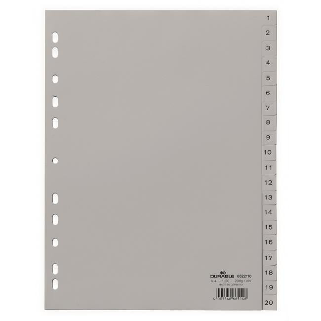 Číselný rozraďovač z polypropylénu. Formát A4, euro-dierovanie. Balenie jedna sada v polyesterovom sáčku. Väčšie balenie 20 sád. Farba sivá.