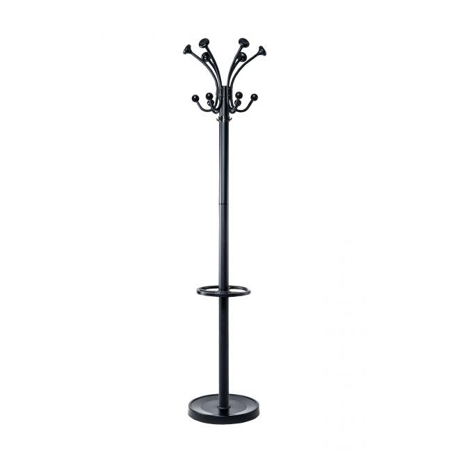 Robustný oceľový vešiak na kabáty sa hodí do každého prostredia. Ťažký betónový podklad potiahnutý plastom zabezpečuje jeho mimoriadnu stabilitu. Matný povrch odolný proti poškriabaniu dáždnikom, lesklý stĺpik, 6 vešiakov na klobúky, 6 na kabáty s priskrutkovanými hrotmi z odolného ABS plastu, 4 prídavné plastové háčiky pod vešiakmi a 4 háčiky na stojane na dáždniky, stojan priemeru 27 cm až na 8 dáždnikov alebo 4 teleskopické dáždniky. Výška 176 cm, priemer základne 36,5 cm, váha 6 kg. Rýchla a jednoduchá montáž. Farba čierna.