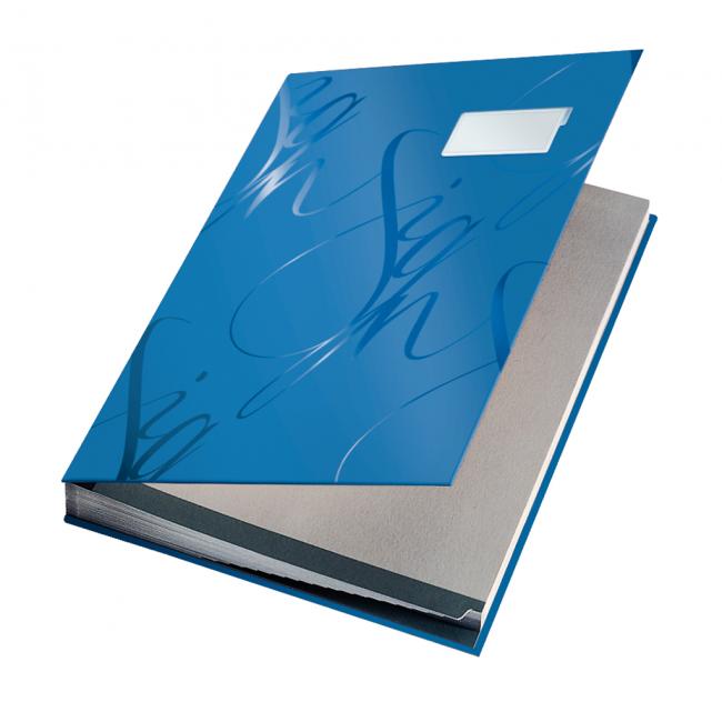 eprezentatívna podpisová kniha pre organizáciu dôležitých dokumentov vyžadujúcich podpis napr. faktúry, zmluvy, atď. Moderný, svieži design s parciálnym lakom na prednej strane. Povrch knihy potiahnutý polaminovaným papierom s hodvábnou fóliou, ktorý je príjemný na dotyk a zároveň chráni knihu pred vodou a prachom. 18 triediacich listov vyrobených zo špeciálneho hrubého kartónu, vďaka ktorému založené papiere z knihy nevypadávajú Popisovateľný štítok na titulnej strane (napr. pre meno oddelenia či nadriadeného). Roztiahnuteľný chrbát umožňuje zvýšiť kapacitu podpisovej knihy. 90 % knihy je vyrobených zo 100 % recyklovaného materiálu. Rozmery 240 x 25 x 340 mm. Farba modrá.