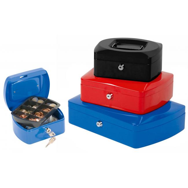 Uzamykateľná pokladnička s tvarovaným úchytom, plastovou priehradkou na mince a 2 kľúčami. Materiál pevná oceľ. Rozmery