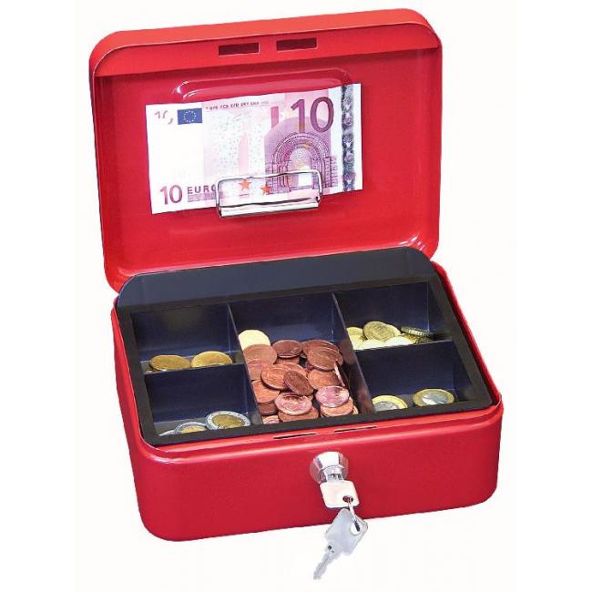 Uzamykateľná pokladnička s tvarovaným úchytom, plastovou priehradkou na mince a 2 kľúčami. Pod vekom zabudovaný klip na prichytenie bankoviek ako prevencia pred ich odfúknutím vetrom. Materiál pevná oceľ.