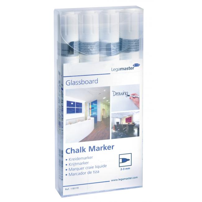 Kriedové popisovače vhodné na sklenené tabule, okná a zrkadlá. Svietiace nepriehľadné farby bez zápachu, stierateľné vlhkou utierkou. Farba biela. Balenie 4 ks.