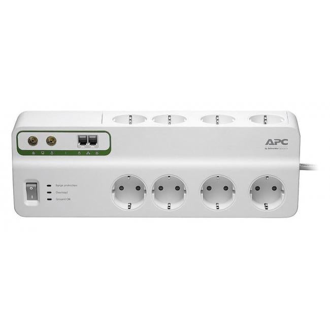 Nové prepäťové ochrany APC s vypínačom a zásuvkami v pravom uhle, čo umožňuje umiestniť zariadenie a nábytok bližšie k stene a zároveň znižuje namáhanie kábla. Ochrana dátových liniek (Ethernet, koaxiálne a telefónne vedenie) zaisťuje úplnú ochranu zariadení pred napäťovým rázom. Je veľmi dôležité chrániť zariadenia pred „skrytými“ rázmi, putujúcimi po dátových linkách, pretože môžu byť rovnako ničivé ako rázy v napájacom vedení. Indikátor funkčnej ochrany SurgeArrest upozorní v prípade, ak prišlo k poškodeniu elektrického zapojenia úderom blesku alebo prúdovým nárazom v elektrickej sieti a systém už nie je schopný poskytovať stopercentnú ochranu. APC 8 zásuviek + tel. Dĺžka kábla 2 m.