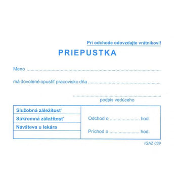 Tlačivo z oblasti práce a mzdy. Priepustka, A7, blok, 100 listov.