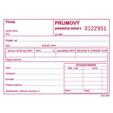 Príjmový pokladničný doklad s DPH, samoprepis. Blok formátu A6, 100 listov, číslovaný.