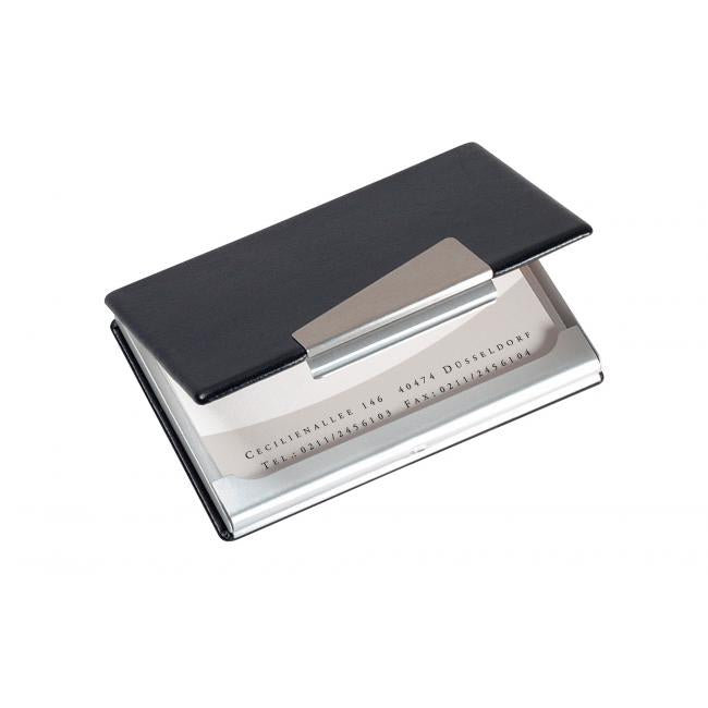 Elegantná krabička na vizitky a magnetické karty, vyrobená z vysokokvalitnej kombinácie hliníka a imitácie kože. Poskytuje bezpečné skladovanie a dokonalú ochranu až pre 20 vizitiek max. rozmerov 90 × 58 mm. Vonkajšie rozmery (š × h × d) 95 × 65 × 12 mm.. Farba čierna. Kapacita 20 vizitiek.