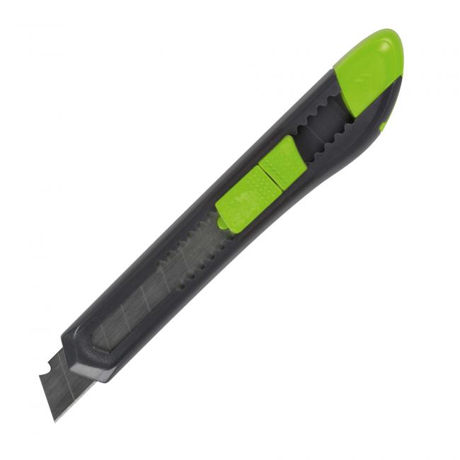 Plastový rezač, šírka čepele 18 mm. Farba čierna/ zelená. Úprava plastová.
