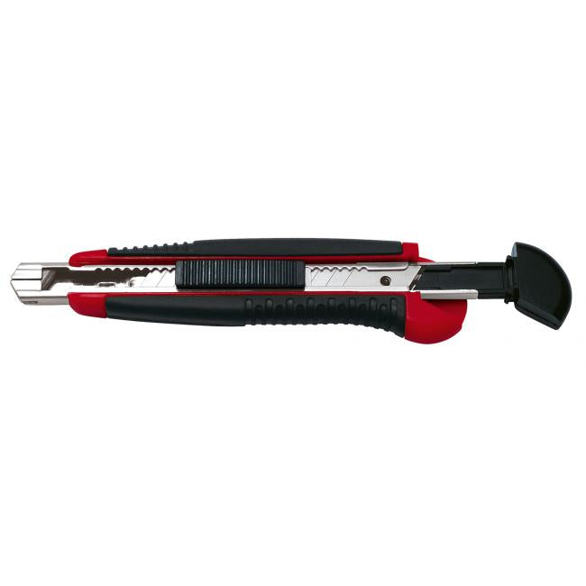 Robustný profesionálny rezač s gumeným vrúbkovaným úchytom, pevným celokovovým vedením noža a automatickým uzamknutím noža. Po vytiahnutí opotrebovaného noža sa zasunutím bežca nainštaluje z integrovaného zásobníka automaticky nôž nový. Šírka čepele 9 mm. V balení 6 náhradných čepiel. Schválené inštitútom TÜV. Farba čierna/červená.