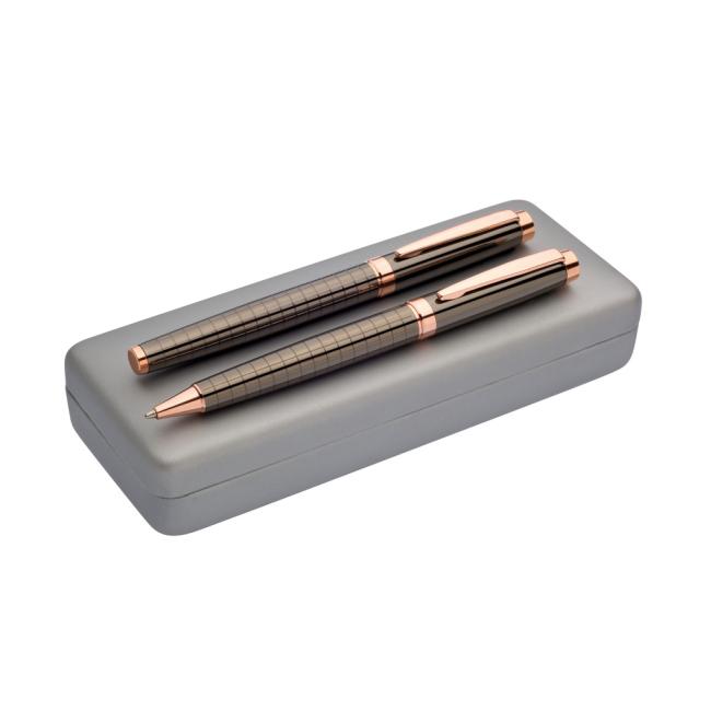 Elegantná sada guľôčkového pera a rolleru MILANO z kolekcie GABRIELIS v sivej darčekovej krabičke. Moderná kombinácia dymovo sivej farby tela a doplnkov farby rosen-gold.
