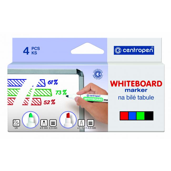 Za sucha stierateľný svetlostály popisovač. Vhodný na biele smaltované tabule, PVC, sklo, porcelán. Okrúhly hrot hrúbky 5 mm. Šírka stopy 2,5 mm. Sada 4 ks.