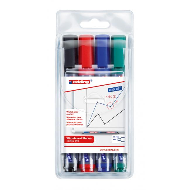 Popisovač vhodný na biele tabule, stierateľný za sucha. Plnený pigmentovým atramentom slabého zápachu bez prísady butylacetátu s vlastnosťou „Cap off“, zabraňujúcou vysychaniu atramentu pri otvorenom hrote aj niekoľko dní. Dopĺňateľný atramentom edding BTK 25. Plastové telo, vymeniteľný hrot. Hrot okrúhly, šírka stopy 1,5---3 mm. Sada 4 ks v mixe farieb.
