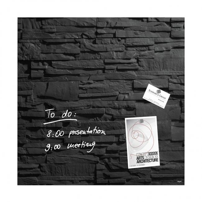 Magnetické tabule z tepelne tvrdeného bezpečnostného skla (EN 12150-1) hrúbky 15 mm s jednoduchou a bezpečnou montážou s certifi kátom TUV dodajú vašim kanceláriám, konferenčným miestnostiam, jedálňam i domácnostiam exkluzívny vzhľad. Sú popisovateľné kriedovými popisovačmi Sigel a za sucha zotierateľné utierkou z mikrovákna. Súčasťou balenia sú 3 super silné neodymové magnety a montážny materiál. Pri používaní príslušenstva Sigel je garantovaná 25-ročná záruka na magnetický sklenený povrch tabule. Rozmery 48 × 48 cm. Dizajn bridlica.
