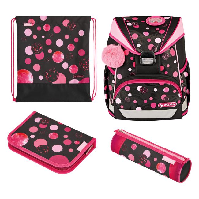 Školská taška UltraLight s anatomicky tvarovanou výstužou chrbta, širokými nastaviteľnými ramennými popruhmi, s hrudným popruhom, predným vreckom a dvomi bočnými vreckami. Reflexné pruhy, dve odnímateľné aplikácie na suchý zips. Hmotnosť 650 g, objem 15 ℓ, rozmery 36 × 28 × 21 cm. Výbava: 16-dielny peračník, vrecko na prezuvky, guľaté puzdro