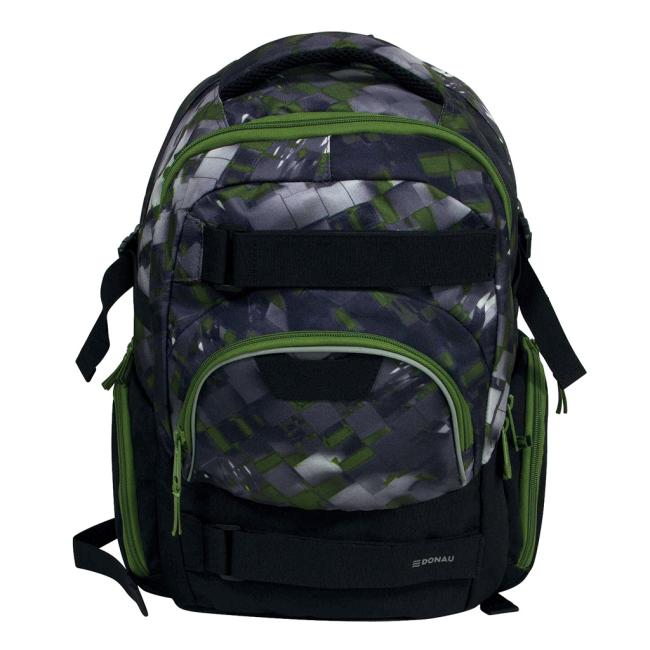Školský batoh vyrobený z vodoodolného, rýchloschnúceho recyklovateľného PET materiálu, s vystuženým chrbtom, nastaviteľnými vystuženými ramennými popruhmi, výškovo nastaviteľný hrudný popruh. Priestranná hlavná priehradka, vystužená priehradka na notebook v hlavnej priehradke, priehradka na zips s organizérom. Dve bočné vrecká na zips, USB port s nabíjacím káblom, upevnenie na skateboard. Kompresné popruhy na boku, reflexné prvky, integrovaná, odnímateľná pláštenka. Objem cca 30 ℓ, rozmer 35 × 45 × 19 cm, vnútorné rozmery 33 × 29 × 18 cm.