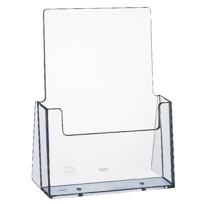Stojan na prospekty formátu A5 s jedným oddielom. Materiál priehľadný číry plast. Rozmery: (š x v x h) 165 x 180 x 78 mm.