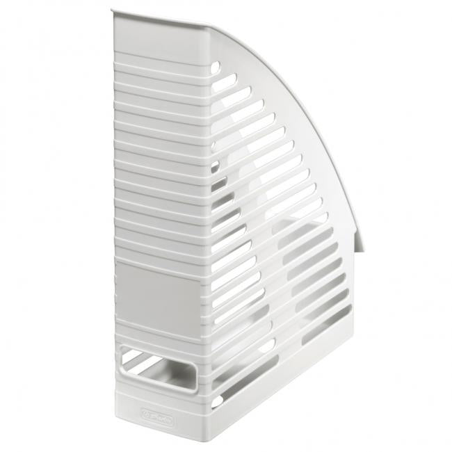 Plastový stojan na časopisy zaoblený dizajn - odolný materiál, miesto na etiketu na chrbte. Farba sivá.