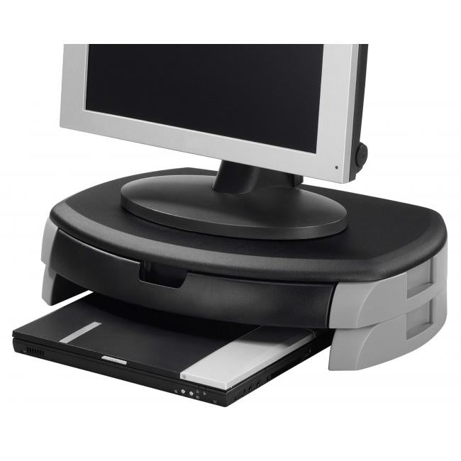 Stojan z robustného plastu pod LCD aj CRT monitory s otváracou poličkou a priestorom na odloženie napr. notebooku. Farba čierna. Rozmery 450 × 113 × 315 mm.