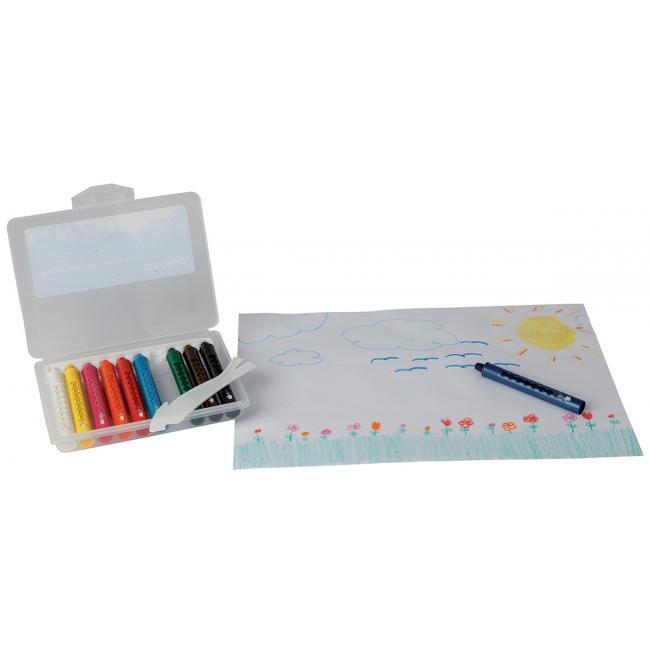 Vodeodolné voskovky. 10 farieb balených v plastovej krabičke so strúhadlom.