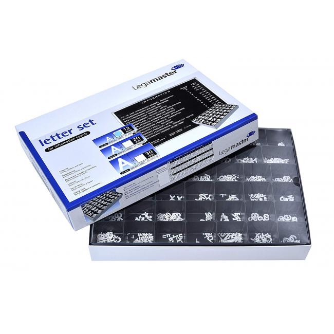 Biele plastové písmená, číslice a znaky k informačným tabuliam. Krabica so samostatnými priehradkami pre každé písmeno. Výška písmen 20 mm. Spolu obsahuje 560 znakov.