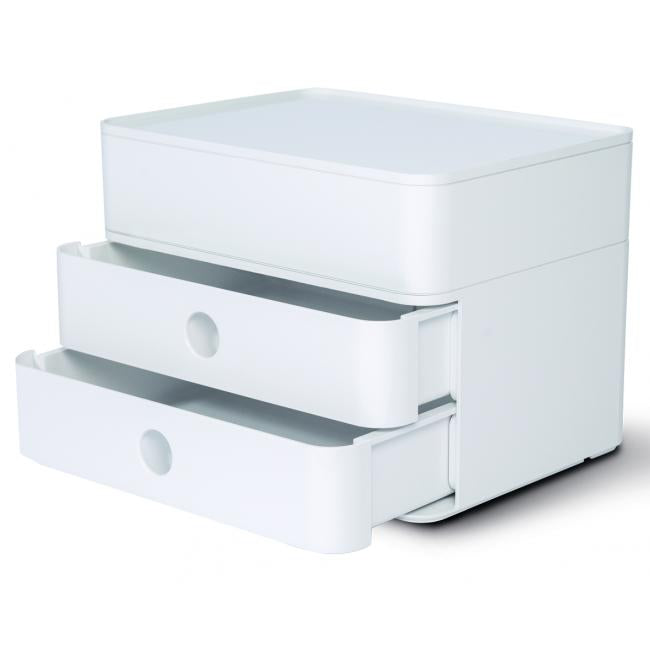 Moderný zásuvkový box v štýlovom dizajne s premyslenými detailami sa inšpiruje flexibilitou a moderným životným štýlom. Obsahuje odkladač s vekom a vyberateľnou miskou a 2 zatvorené zásuvky s oddeľovačmi a inteligentným otvorom pre kábel. Veko sa dá použiť ako servírovacia tácka. Rozmery (š × v × h) 260 × 195 × 190 mm. Farba biela.