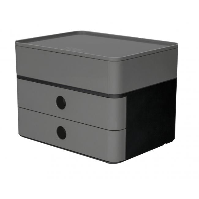 Moderný zásuvkový box v štýlovom dizajne s premyslenými detailami sa inšpiruje fl exibilitou a moderným životným štýlom. Obsahuje odkladač s vekom a vyberateľnou miskou a 2 zatvorené zásuvky s oddeľovačmi a inteligentným otvorom pre kábel. Veko sa dá použiť ako servírovacia tácka. Rozmery (š × v × h) 260 × 195 × 190 mm. Farba sivá.