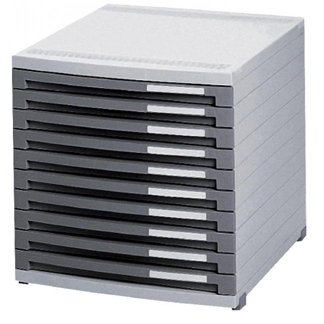 Box z modulárneho systému zásuvkových boxov s horizontálnym aj vertikálnym spájaním. Model s otvorenými zásuvkami (bez predného krytu) výšky 25 mm a zarážkou chrániacou zásuvky pred úplným vysunutím. Súčasťou sú identifikačné menovky na označenie zásuviek.Telo boxov vo svetlosivej farbe, zásuvky tmavosivé. Rozmery (š × v × h) 30 × 30,7 × 38,2 cm.