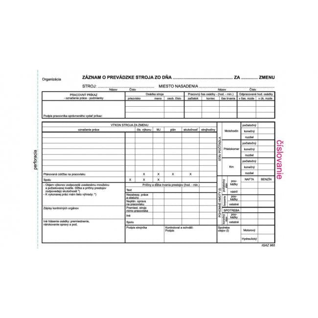 Tlačivo : Záznam o prevádzke stroja A5 číslovaný, balenie 100 listov.