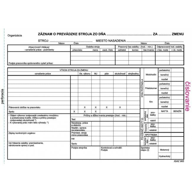 Tlačivo : Záznam o prevádzke stroja A5, 100 listov, samoprepis - originál + 1 kópia, číslovaný.